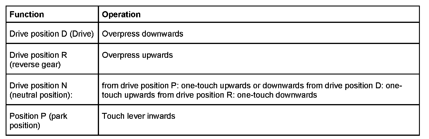 The gear selector lever is used for fully electronic selection of the gear positions R - N - D and P (reverse gear - neutral position - drive - park position).