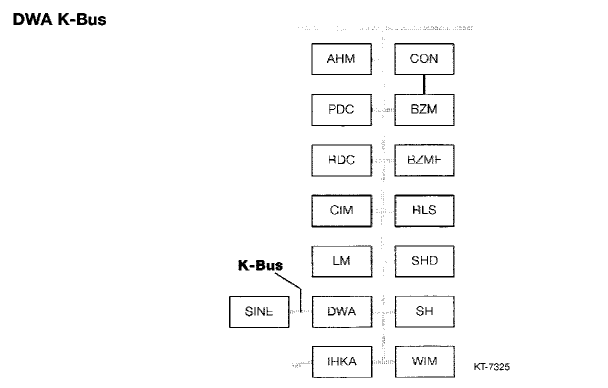 The functions of the alarm system are split between the two control units (DWA and SINE). The alarm system K bus enables communication between those two control units.
