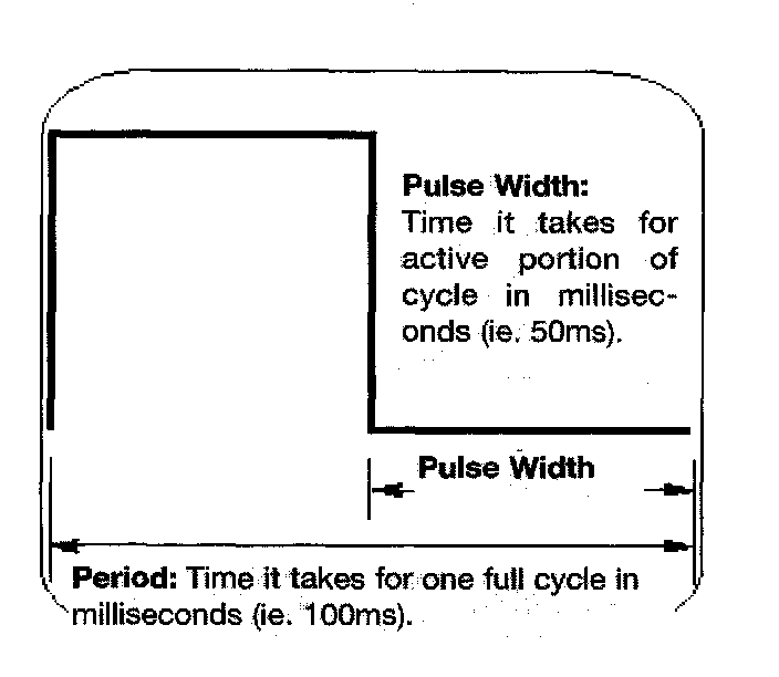 The Pulse Width of a square wave is the length of time one pulse is ON. Vehicle systems may use fixed or varied ON times or pulse width. Pulse width is expressed in milliseconds (ms).
