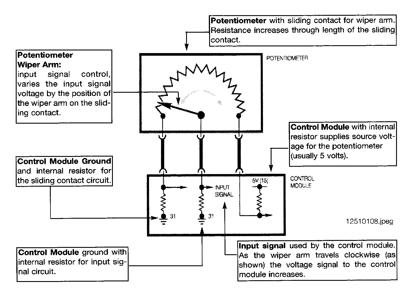 A Potentiometer produces a gradually changing voltage signal to a control module. The signal is infinitely variable within the operating range of the sensor.