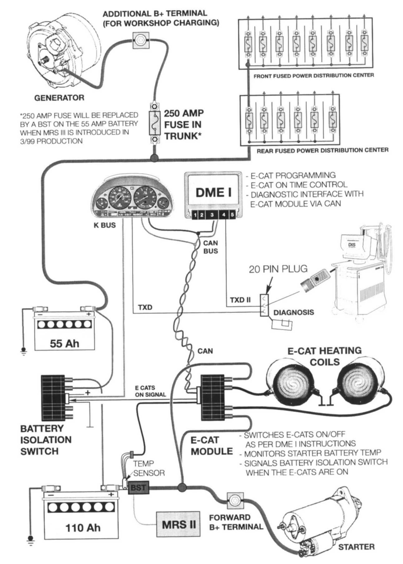 The dual battery system on the 750iL is necessary due to the addition of the E-CATs. If a single battery system was used, the E-CATs would be provided power from the single battery just after cold engine start-up when the battery is at its lowest capacity This would increase engine loads due to charging of the single battery and cause an increase in injector "On" time during the cold engine warm-up period, which result in unnecessary tail pipe emissions.