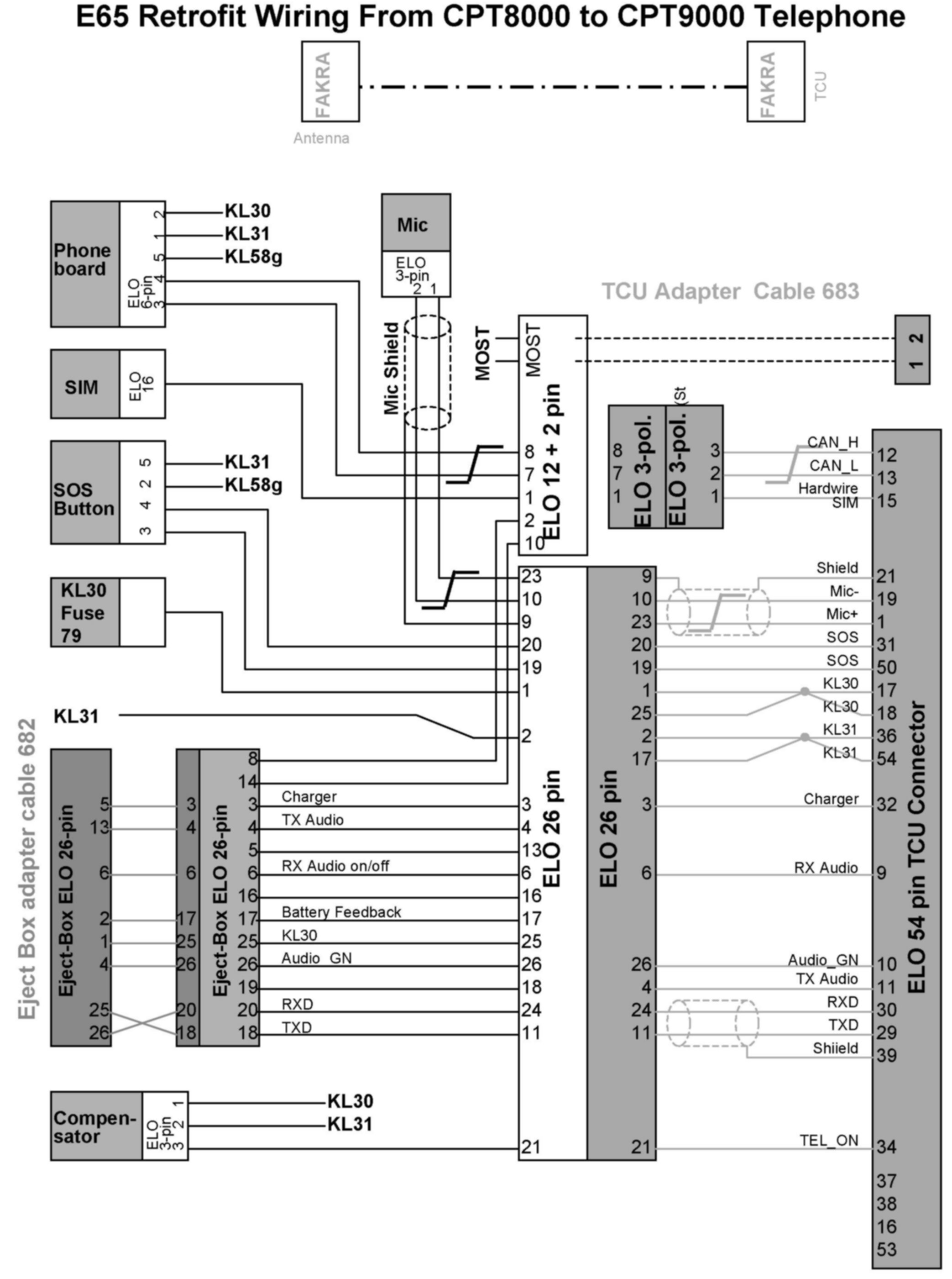 Refer to the document "E65 Retrofit Wiring" shown for an overview of the system.