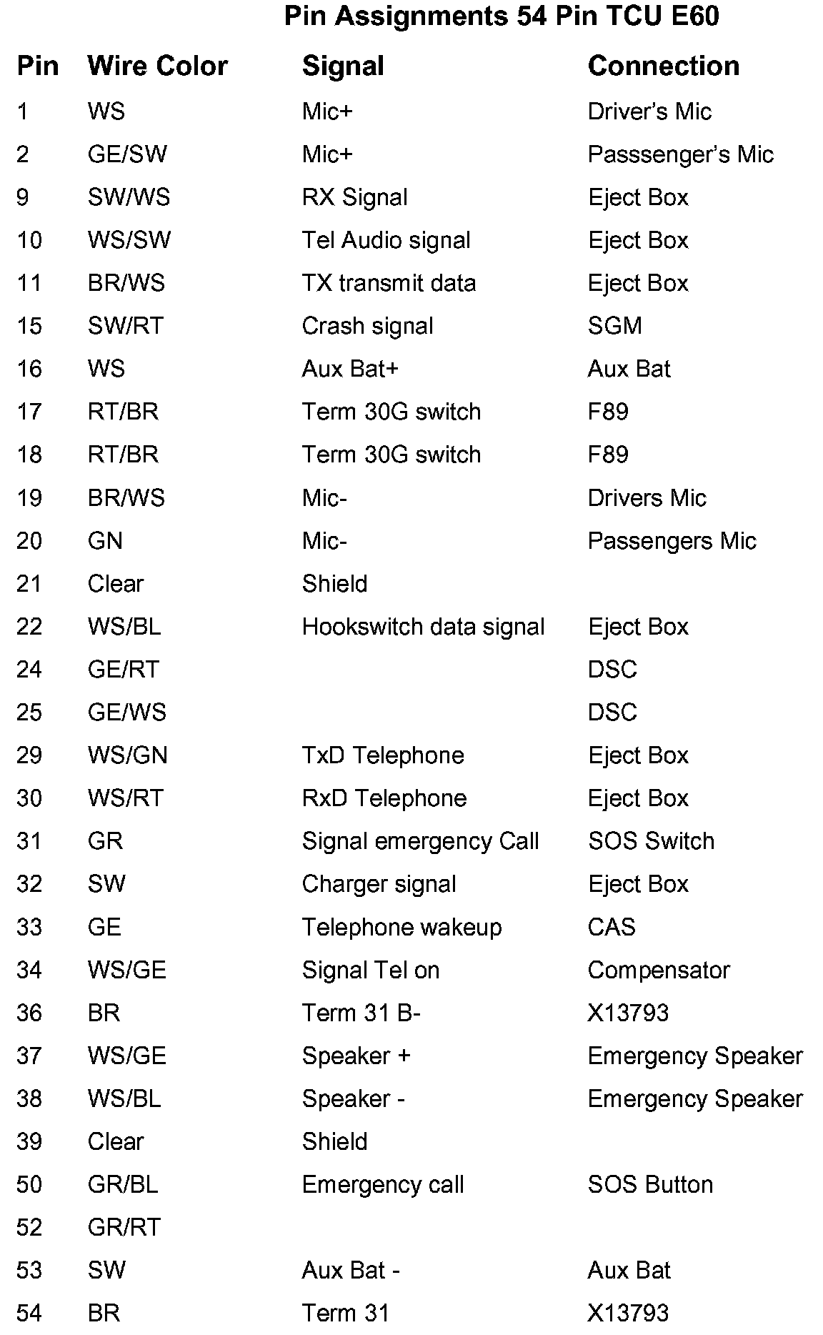 Pin Assignments 54 Pin TCU E60