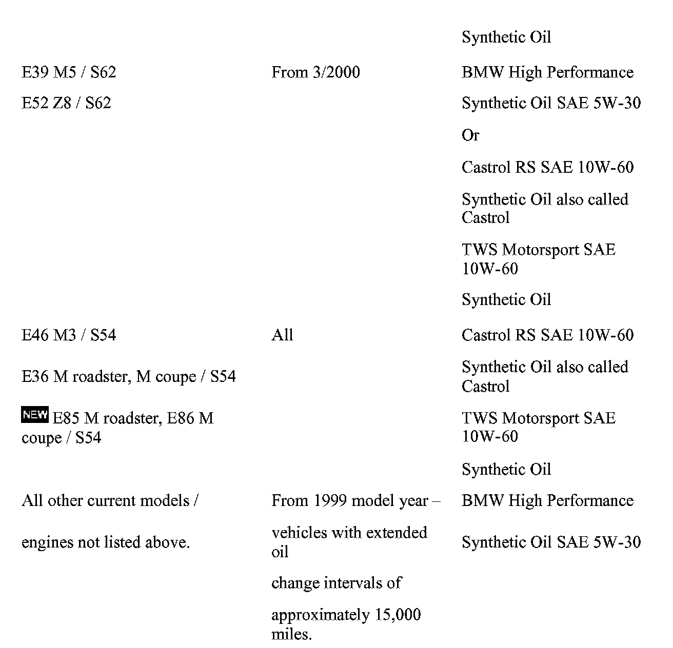 BMW High Performance Synthetic oil must be used on all 1999 and later BMW vehicles which have oil change intervals of approximately 15,000 miles (except M5 produced up to 3/00 and E46 M3, E36 M roadster and M coupe with S54 engines) as stated in the owners manual. In addition, there is a label affixed to the engine cover which states the oil specifications and refers to the BMW website and toll free number for additional information.