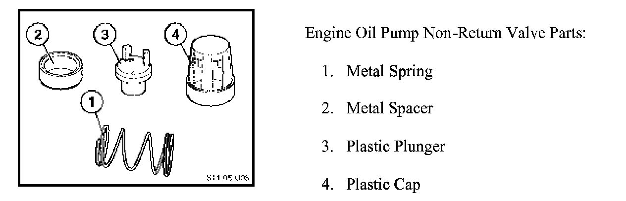 While performing an oil service, removal of the oil filter may reveal one or more of the following parts have dislodged from the engine oil pump. These parts make up the internal non-return valve inside the engine oil pump. The customer does not complain of loss of oil pressure while driving or does the vehicle exhibit any drivability complaints.