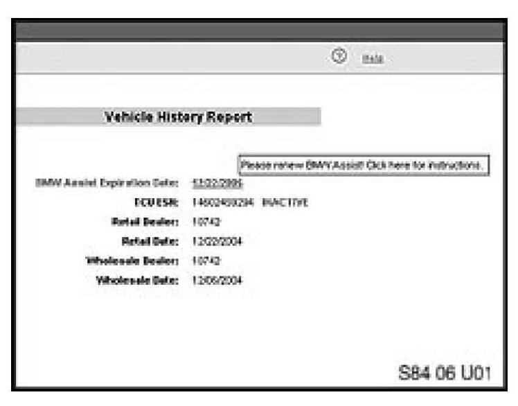 7. Check the BMW Assist account status on DCSnet. The BMW Assist services expiration date and TCU activation status can be checked on DCSnet under Service/Vehicle History Inquiry. Refer to SI B02 01 06 (Updated DCSnet Vehicle History Inquiry information of BMW Assist) for more information.
