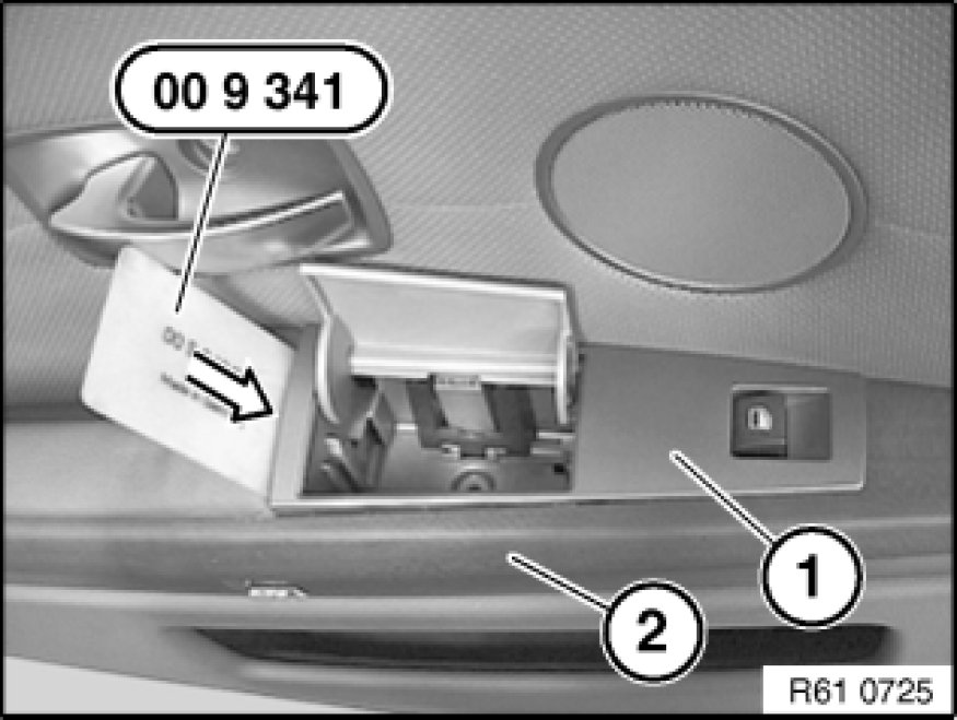 To prevent damage to armrest pad: insert rear power window switch (1) guided by special tool 00 9 341 into armrest on rear door (2).
