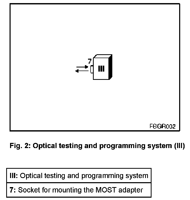 For the optical test of a control module (or fibre-optic cable), the control module (or fibre-optic cable) must be connected to the optical testing and programming system using an adapter. However, each adapter has a different attenuation value. So that these different attenuation values are taken into account in the optical test, calibration must be carried out before each optical test. During the calibration, there is also a check as to whether the adapter is OK. The various calibrations, depending on whether a MOST control module or a fiber-optic cable is being tested, are shown below.
