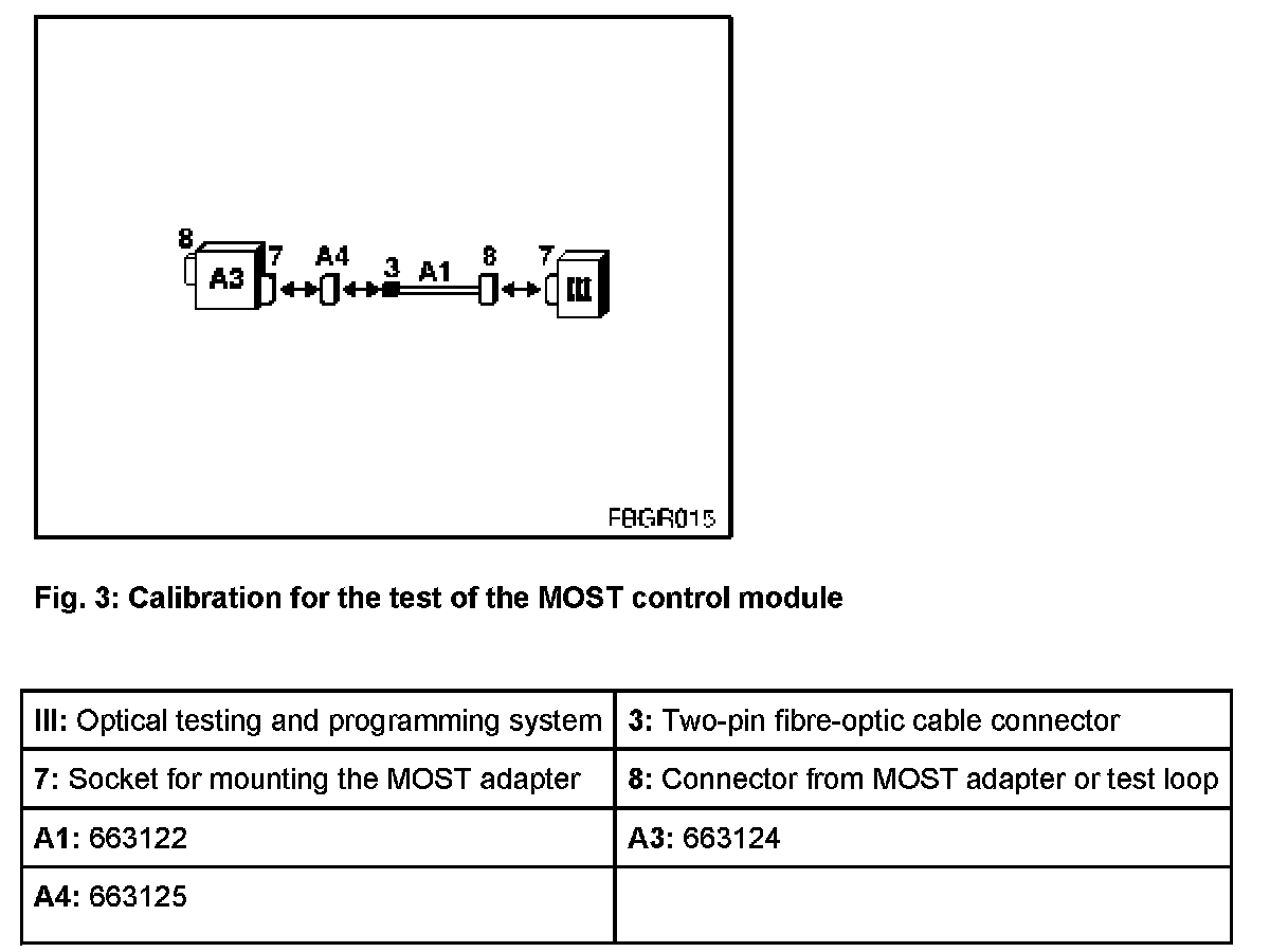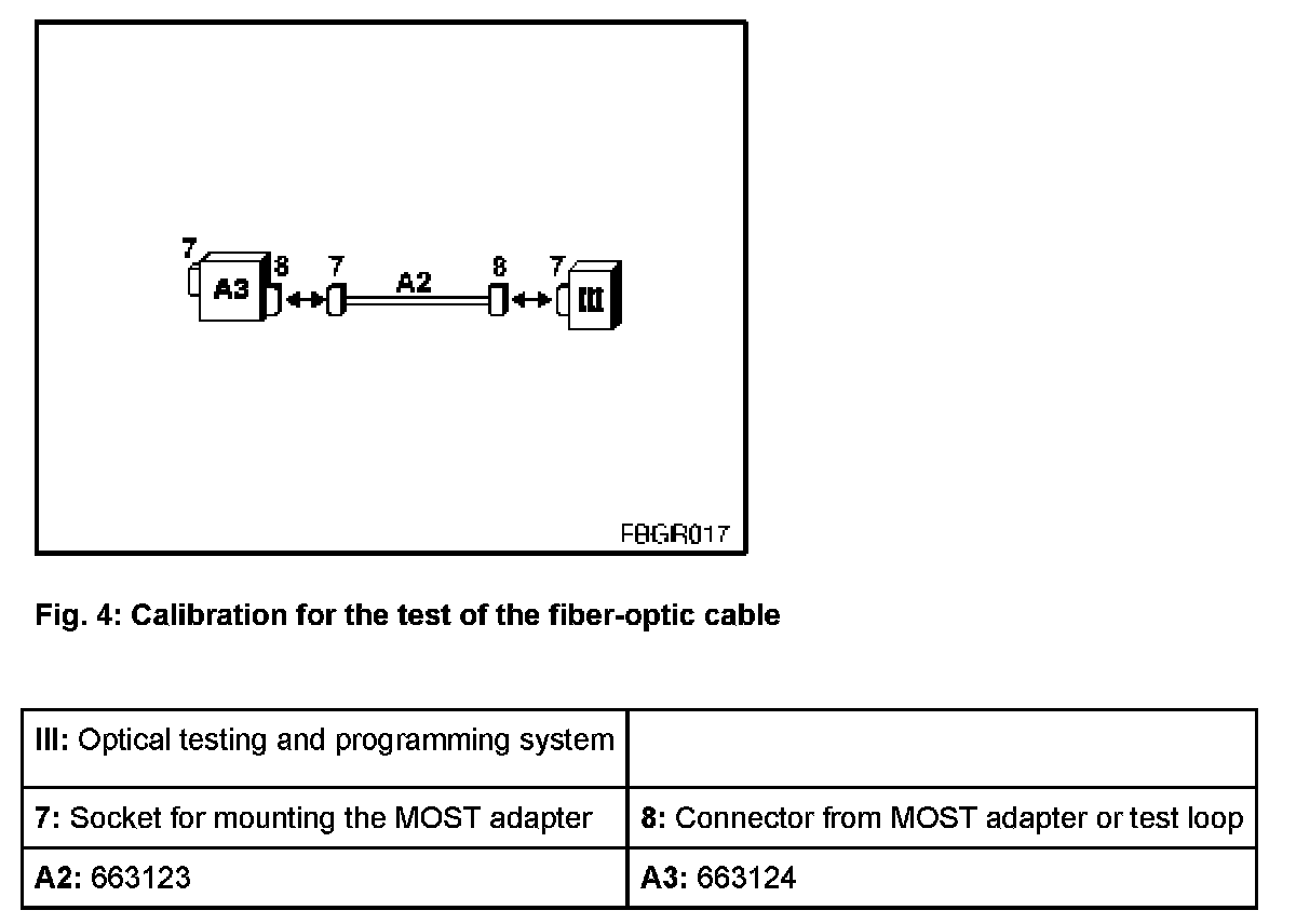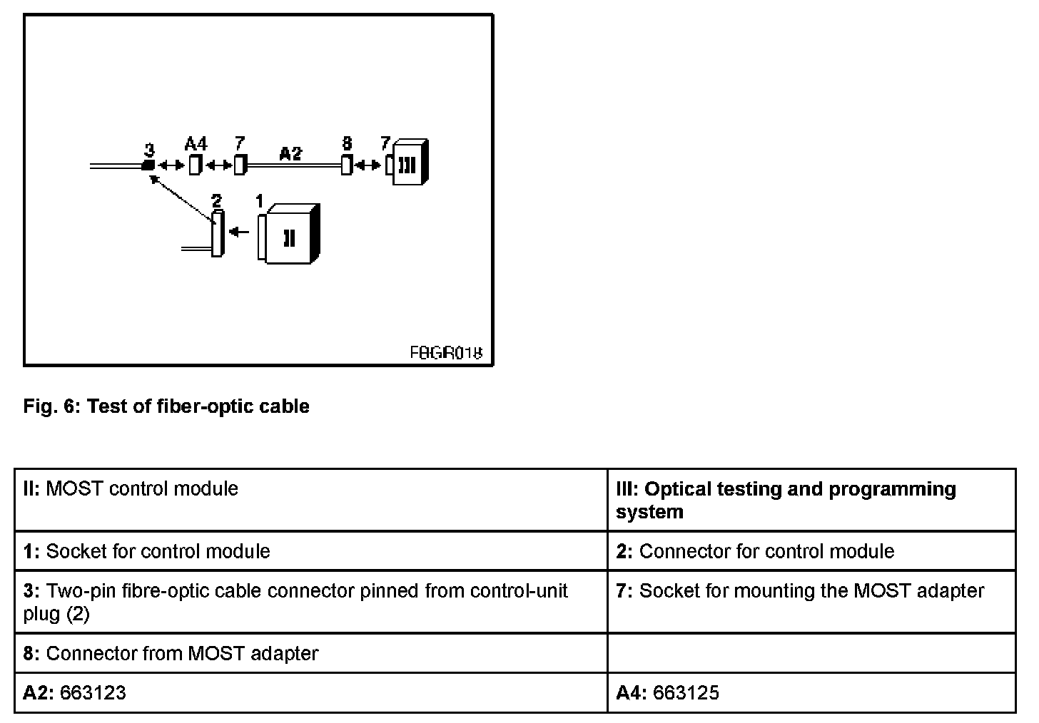 Test of fibre-optic cable: To test the fibre-optic cable, the MOST wiring harness extension (A2 = 663123) and plug housing are required (A4 = 663125). Procedure for testing the fiber-optic cable: