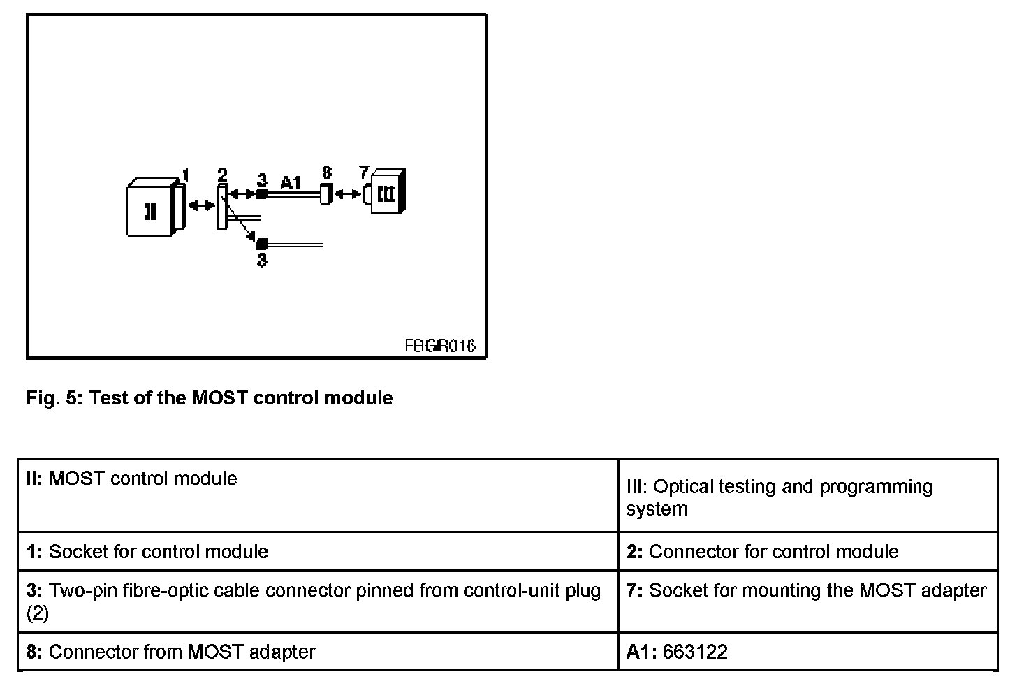 Test of the MOST control module: To test a MOST control module, (II) the MOST control module cable is required (A1 = 663122). Procedure for testing a MOST control module:
