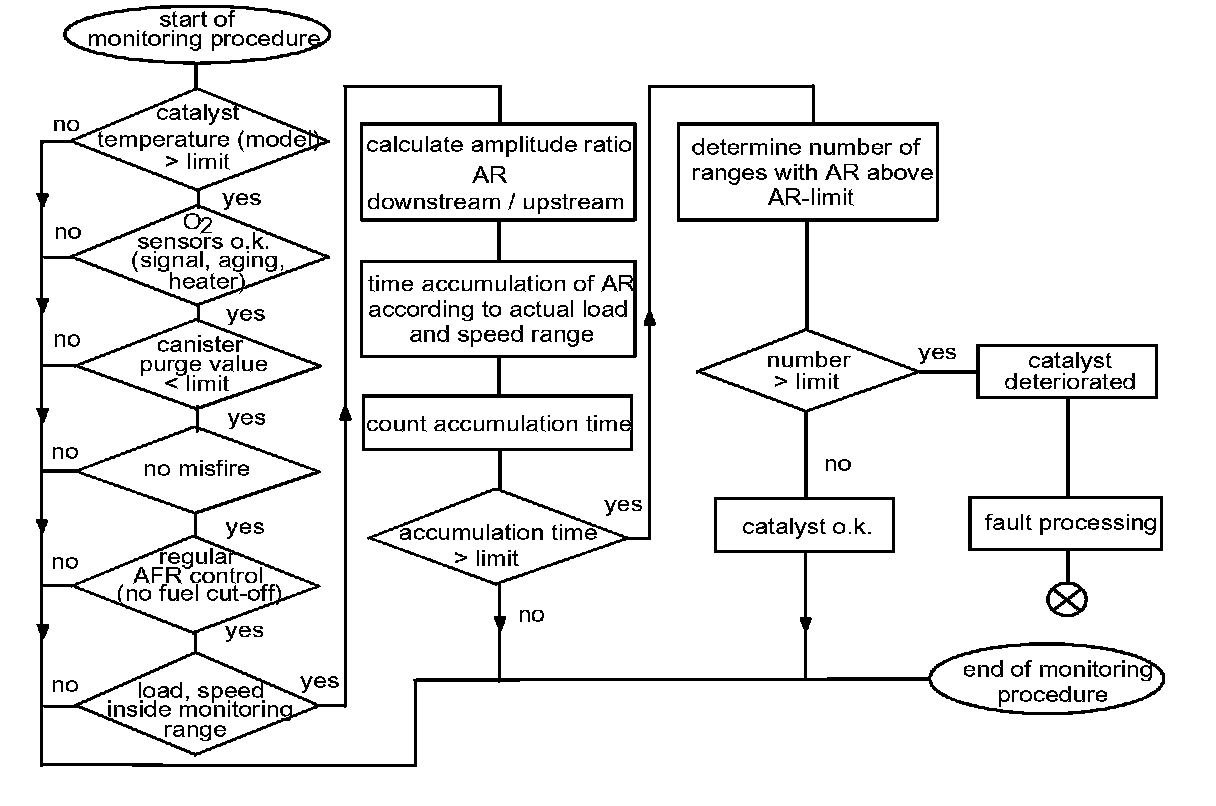 The Catalyst Monitor is based on determining the oxygen storage capability. The (nonlinear) correlation between conversion efficiency and storage capability has been shown in various investigations. The catalyst is diagnosed by comparing its storage capability against the storage capability of a borderline catalyst.