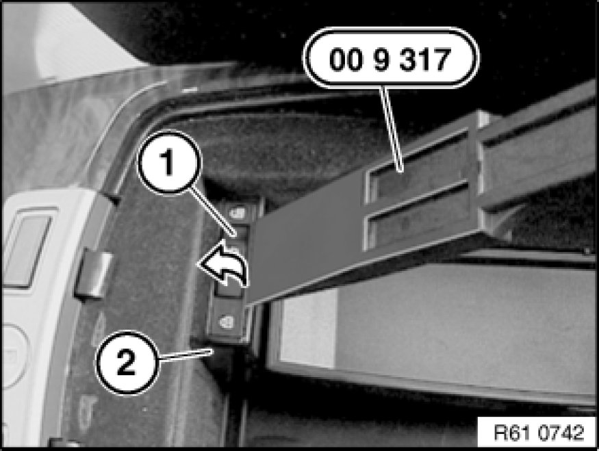 Lever hotel setting switch (1) with special tool 00 9 317 00 9 317 Trim Panel Wedge in direction of arrow out of housing (2).