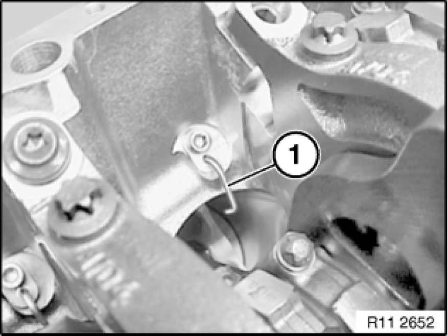 When removing and installing pistons with conrods, make sure piston cooling spray nozzles (1) are not bent.