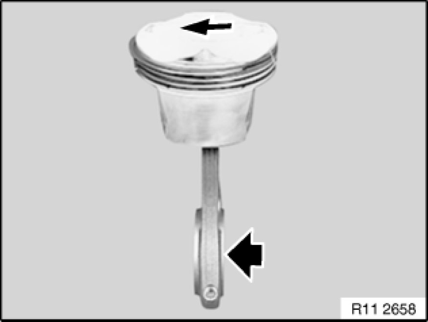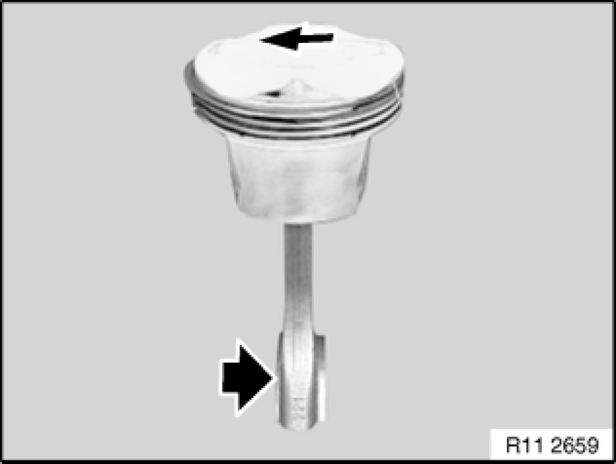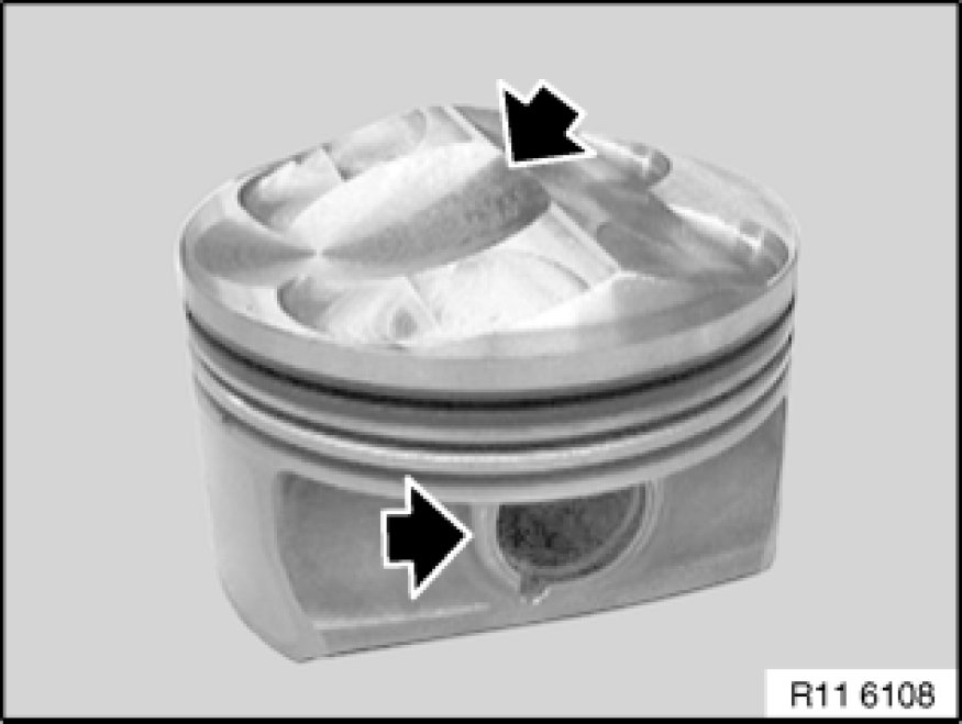Due to the design of the piston head and the piston pin offset, the pistons are constructed specifically for each cylinder bank and must not be mixed up.