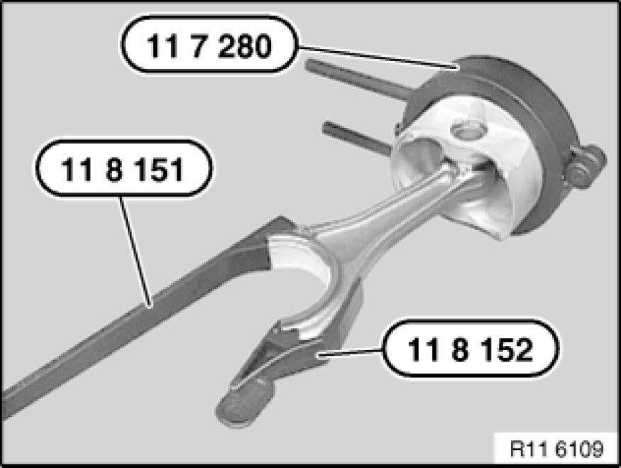 Insert special tools 11 8 151 11 8 150 Insertion Tool and 11 8 152 11 8 150 Insertion Tool in conrod.