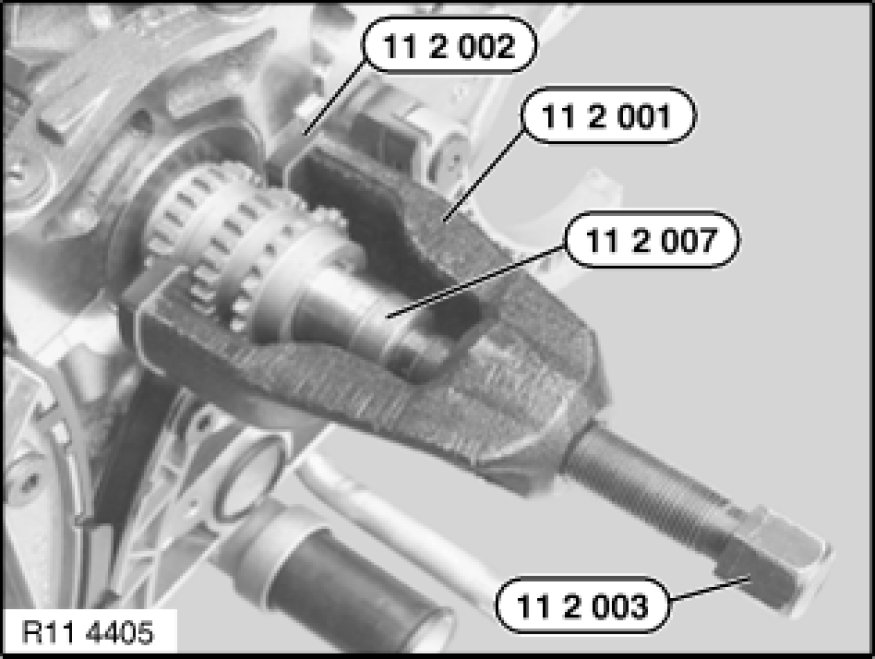 Insert special tool 11 2 007 11 2 000 Puller and remove sprocket wheel with special tool 11 2 003 11 2 000 Puller.