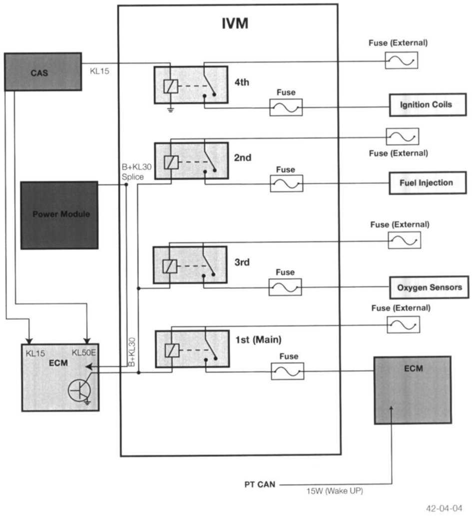 The IVM contains integral relays, replaceable fuses and offers a convenient splice point for harness connections. The IVM serves as a central power supply for Engine Management (including Valvetronic), Electronic Transmission and DSC. This diagram is a partial representation of the IVM for Engine Electronics.