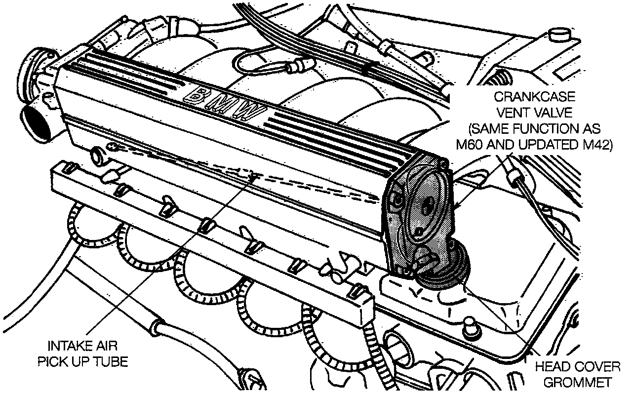 The M73 uses two new type crankcase ventilation valves which function similarly to the ones used in the updated M42 and all M60 engines. The oil vapors in the crankcase enter the oil/vapor separators incorporated in each cylinder head cover allowing the liquid oil to return to the crankcase and the oil vapors to be drawn into the intake manifolds via the crankcase ventilation valves. Since the crankcase ventilation valves are influenced by engine vacuum, the amount of valve opening is varied continually through all engine operating conditions. Under low engine vacuum conditions the valves are fully opened by spring pressure and with high engine vacuum conditions the valves are closed.
