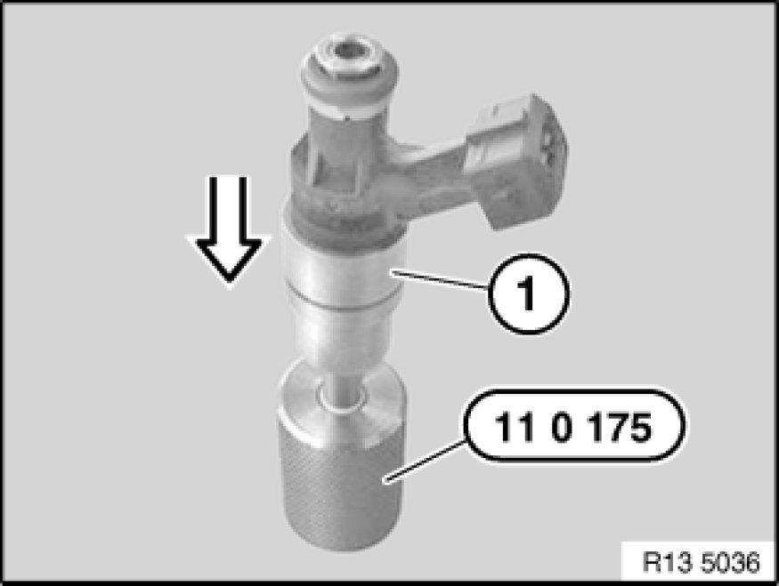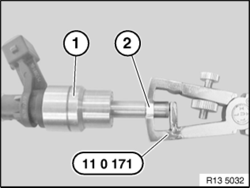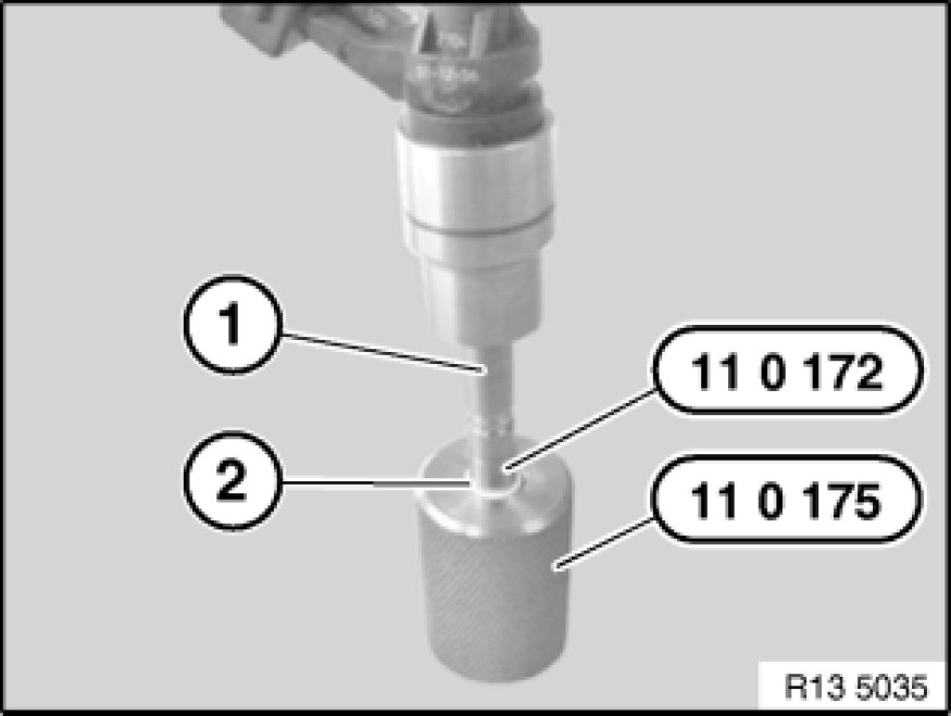 Fit special tool 11 0 172 with preassembled Teflon ring (2) on injector (1).