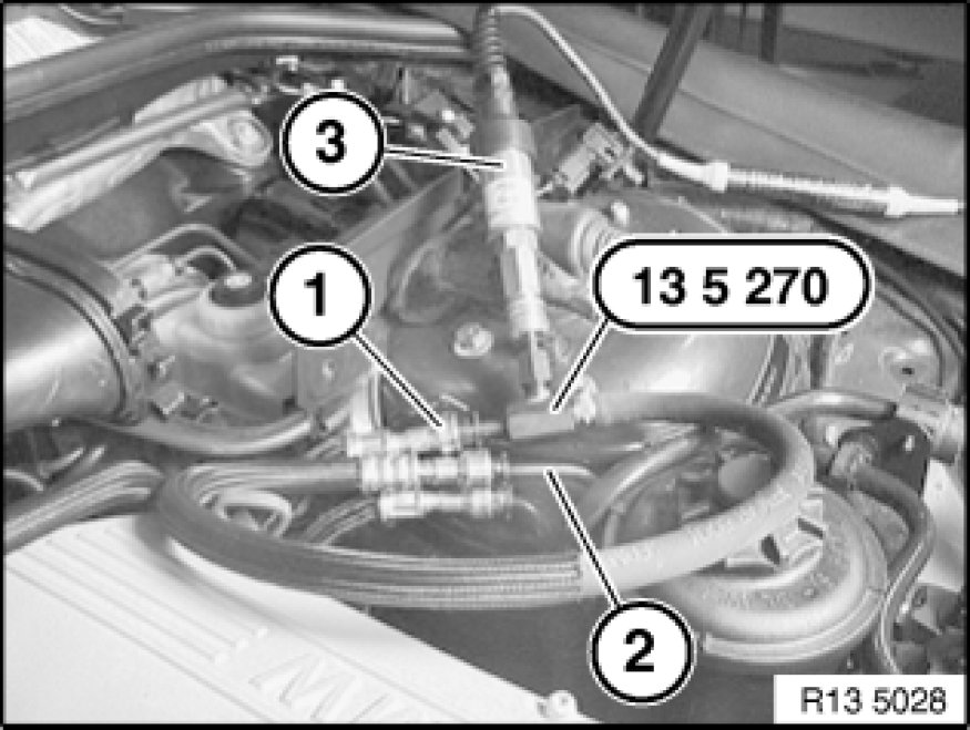 Insert special tool 13 5 270 13 5 270 Adapter Hose with Coupler Plug between lines (1) and (2).