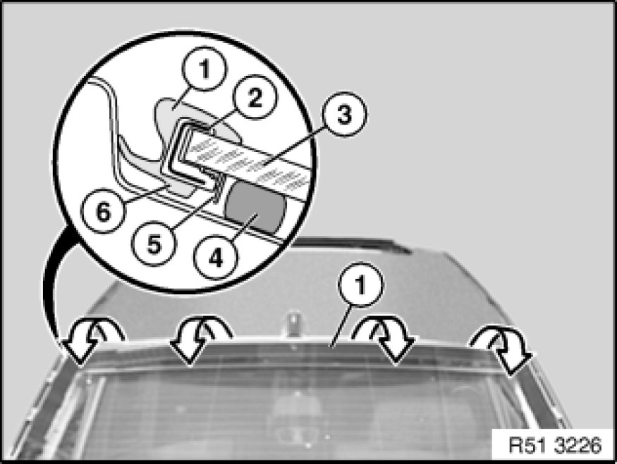 When rubber frame (1) is removed, tear-off lip (5) may tear off and remain in vehicle.