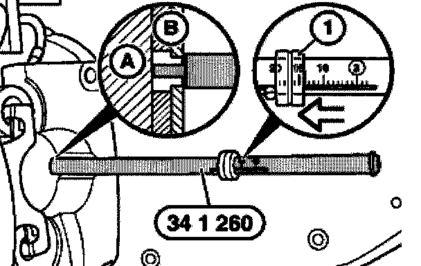 Press special tool onto brake lining. Slide ring (1) in direction of arrow as far as it will go and read off measured value.