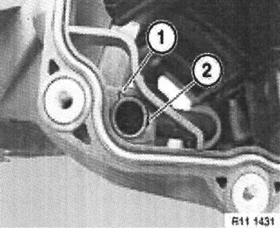 Note: Vent pipe is located with a lug (1) and locked with a retaining lug (2) in intake air manifold.