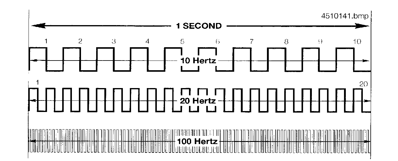 The frequency of a modulated square wave signal is the number of complete cycles or pulses that occur in one second. This number of cycles or frequency is expressed in Hertz (Hz). 1 Hz - 1 complete cycle per second.