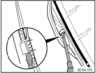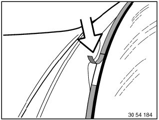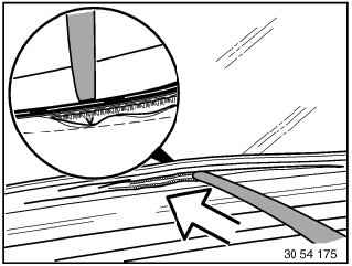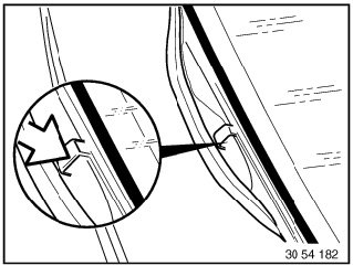 Apply an even coating of profile rubber adhesive (sourcing reference: BMW Parts Service) to rear side of leading fabric edge and sealing tape and allow to dry for approx. 10 minutes. Raise PVC welt with fishbone and insert convertible top fabric without folds, rub firmly with fishbone.