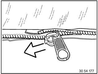 Insert second half of zip fastener on fabric top in zip fastener slide so that both leading fabric edges (1) of zip fastener are flush.