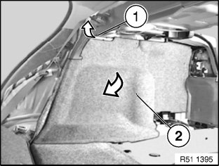 Partially lever out outer trim (1) and remove trunk wheel arch trim (2).