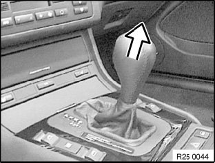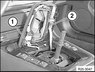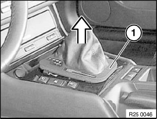 Remove trim (1) with rubber gaiter from center console.