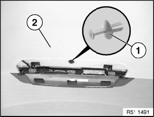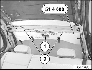 Release expansion rivet (1) at rear of headliner (2).