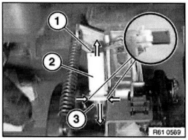 Press both retaining clips together at front end and pull out switch (2) in direction of arrow towards rear.