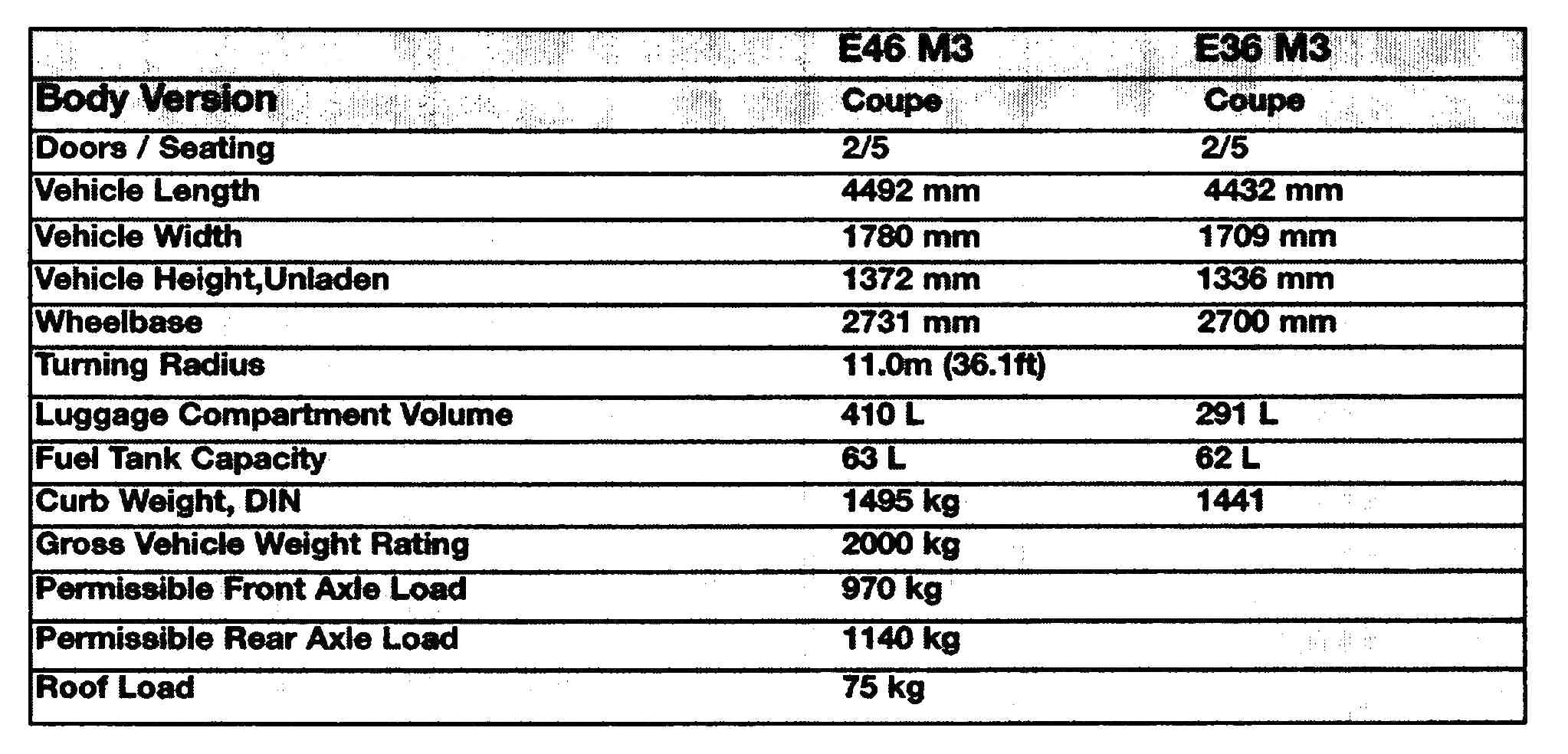 E46 M3 Specifications Table