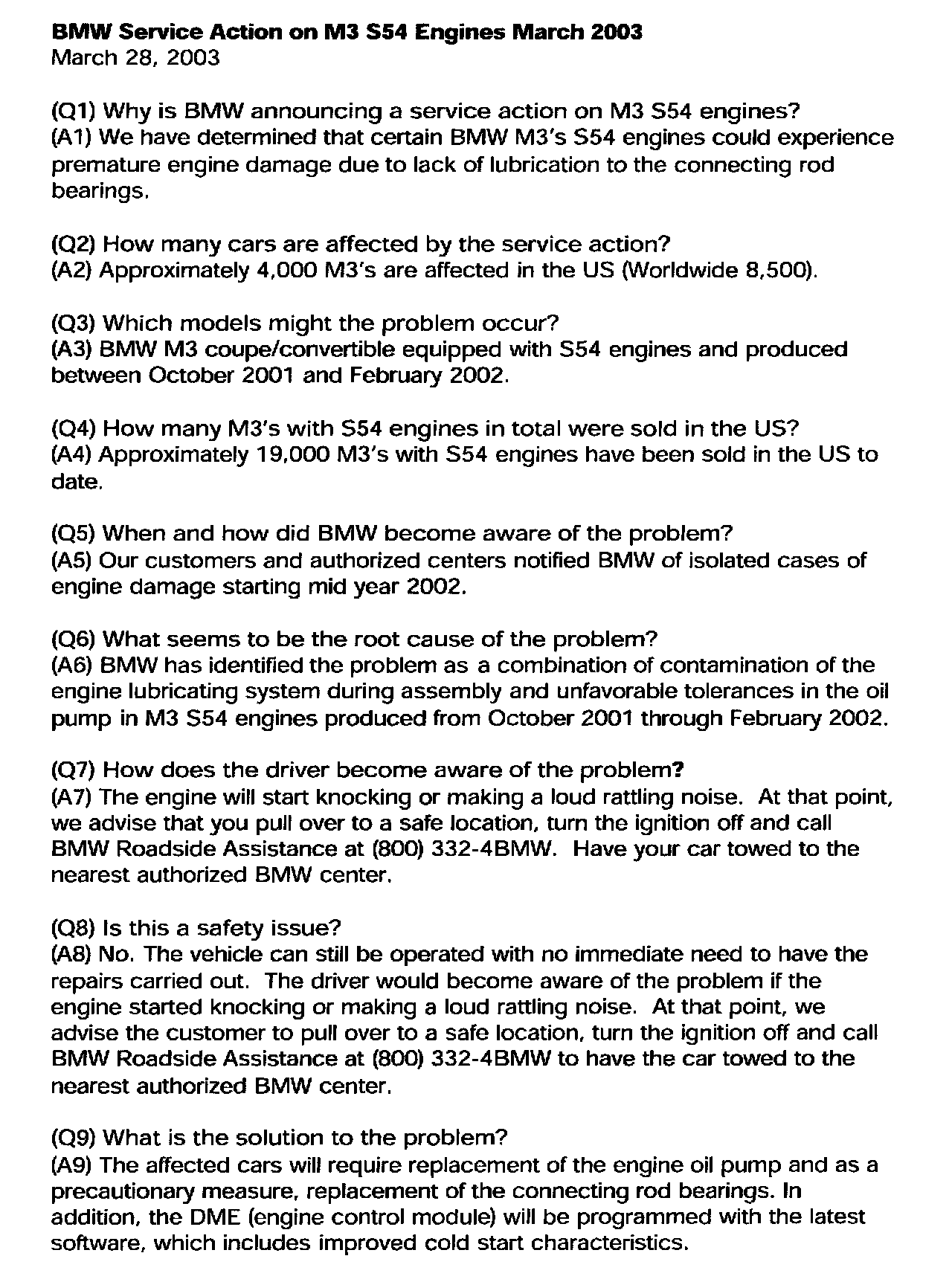 [NEW] After intensive and thorough investigation is was concluded that due to contamination of the S54 engine lubricating system during engine assembly in combination with unfavorable tolerances in the oil pump, the connecting rod bearings can be overheated which may lead to their damage and possible engine failure on M3 coupe/convertible vehicles produced from October 2001 through February 2002.