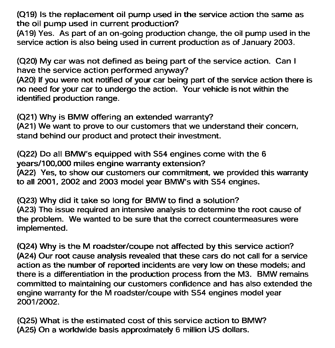 [NEW] Also, in order to further strengthen our customer's confidence in the M brand products, BMW of North America has extended the warranty on all internal mechanical engine components that are lubricated by engine oil to 6 years or 100,000 miles, whichever comes first, for all model year 2001, 2002, and 2003 (up to September 2003 production) on M cars with 6 cylinder (S54) engine (VIN specific). Use DCS to check if a specific VIN is affected by this engine warranty extension.