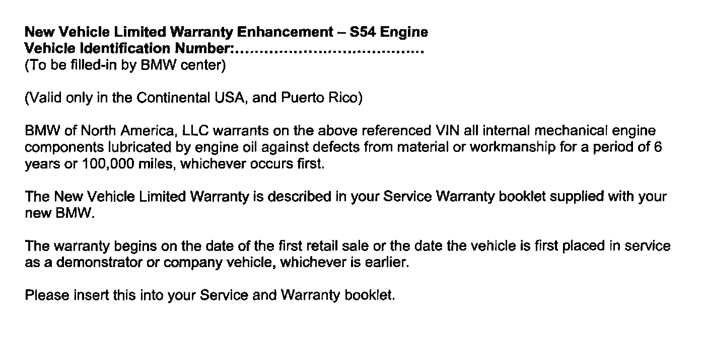 Please make sure that this supplemental page, with the VIN filled-in, is inserted into the Service and Warranty booklet on all S54 equipped vehicles in your stock inventory prior to customer delivery, if not already performed during vehicle processing at VDC/ICP.