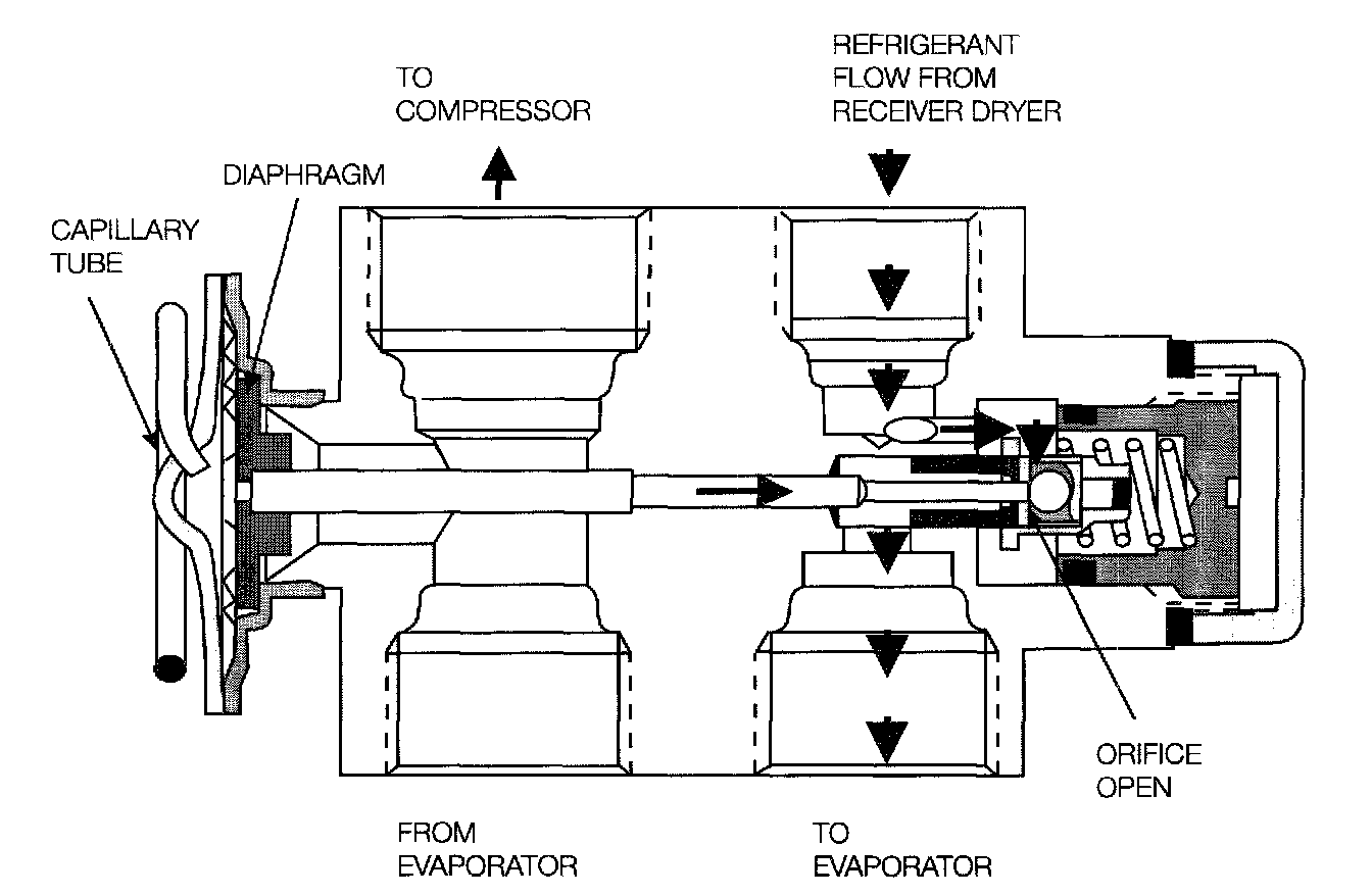 A block-valve design of expansion valve is used on current BMW A/C systems. The refrigerant enters at the upper right inlet. At the left of the valve there is a capillary tube filled with an inert gas, that senses the temperature of the air coming into the housing from the plenum. When the air temperature in the plenum rises, the pressure in the capillary tube increases. This pushes down on a diaphragm and pushrod assembly, which increases the size of the orifice opening, allowing more refrigerant into the evaporator and providing more cooling. When plenum temperature falls, the pressure in the capillary tube falls. The spring pushes up on the pushrod, making the orifice opening smaller; less refrigerant is allowed into the evaporator, allowing less cooling.