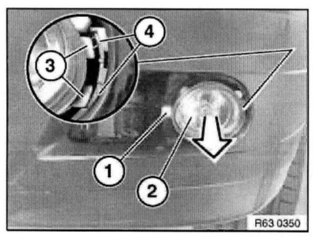 Feed foglamp insert (3) in direction of arrow out of outer guides (2) and remove.
