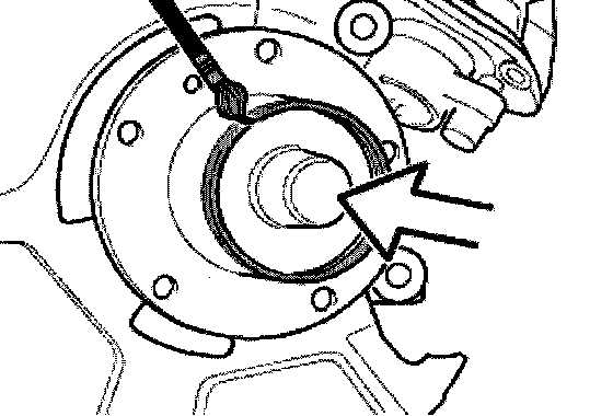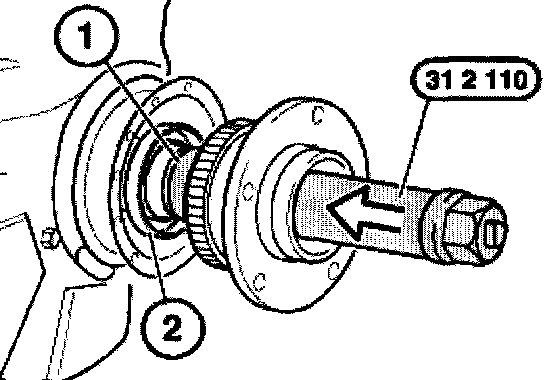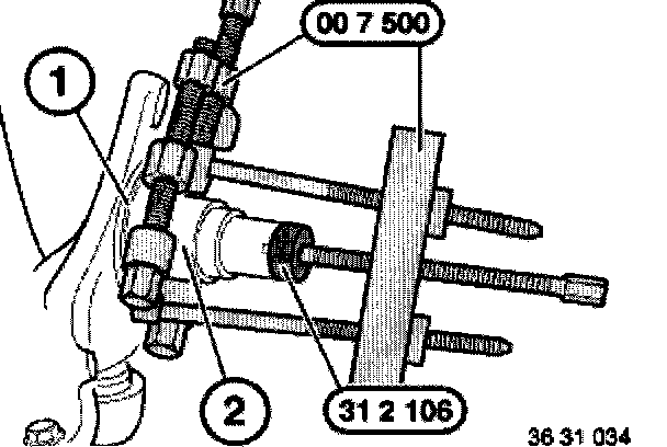 Bend back dust guard plate (1). Fit pulling-off claws of special tool 00 7 500 behind bearing inner race (2). Pull off bearing inner race with special tool 00 7 500 and 31 2 106.