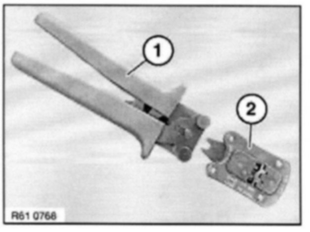 To crimp MQS contacts, use pliers 61 4 321 (1) in conjunction with crimping head 61 4 324 (2) from crimping set 61 4 320