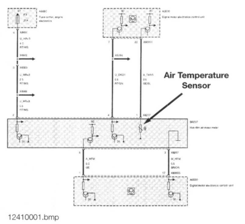 The HFM contains an integral air temperature sensor. This is a Negative Temperature Coefficient (NTC) type sensor. This signal is needed by the ECM to correct the air volume input for changes in the intake air temperature (air density) affecting the amount of fuel injected, ignition timing and Secondary Air Injection activation.