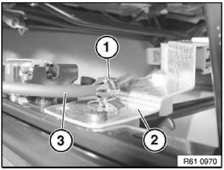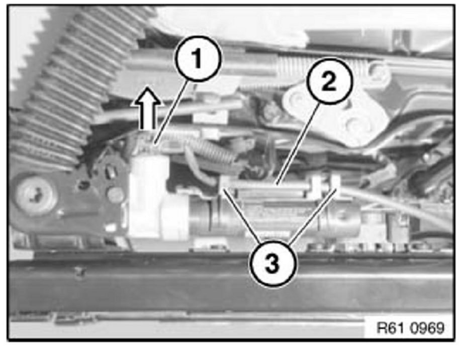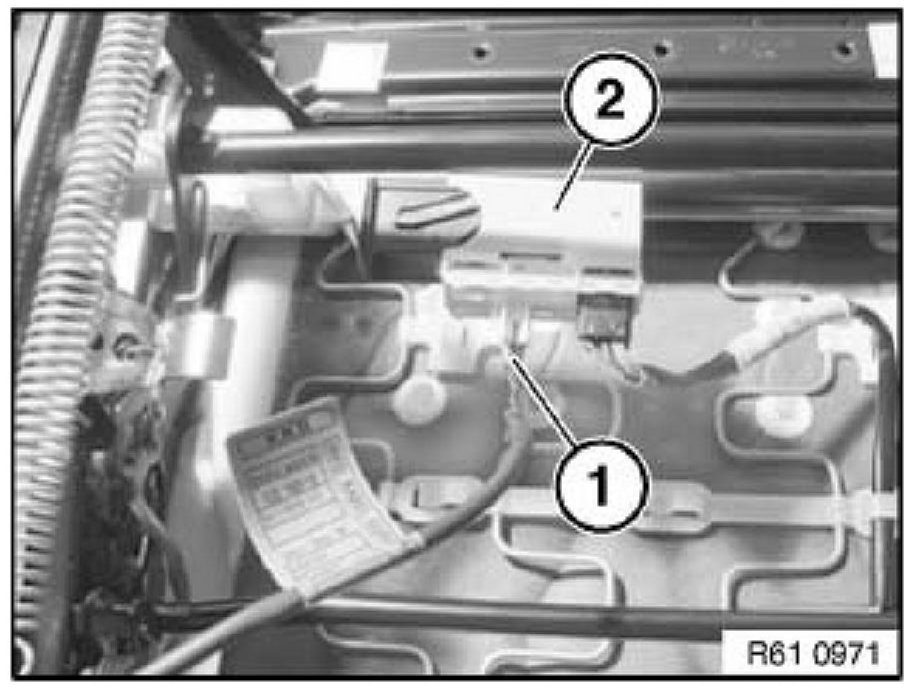 Unclip retainer (1) from carrier (2) and unthread seat wiring harness (3).