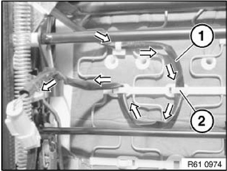 Route repair wiring harness section (1) under the seat and into the plastic clips (2) in the order shown.