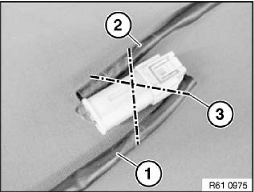 Remove the fabric adhesive tape from the vehicle wiring harness and slide back insulating sleeve (1) approximately 300 mm.