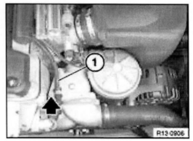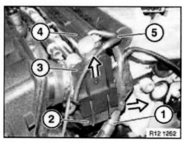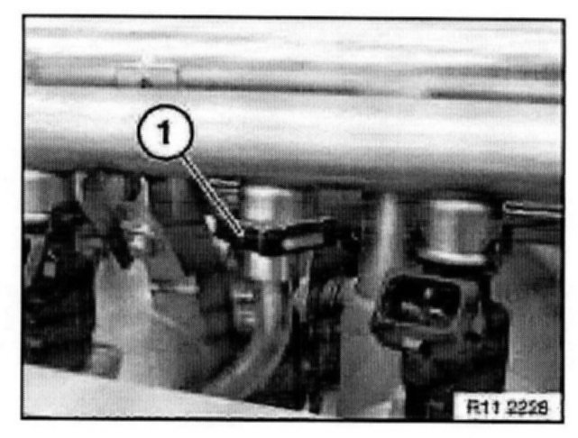 Detach retainer (1). Pull fuel line out of fuel injector rail.