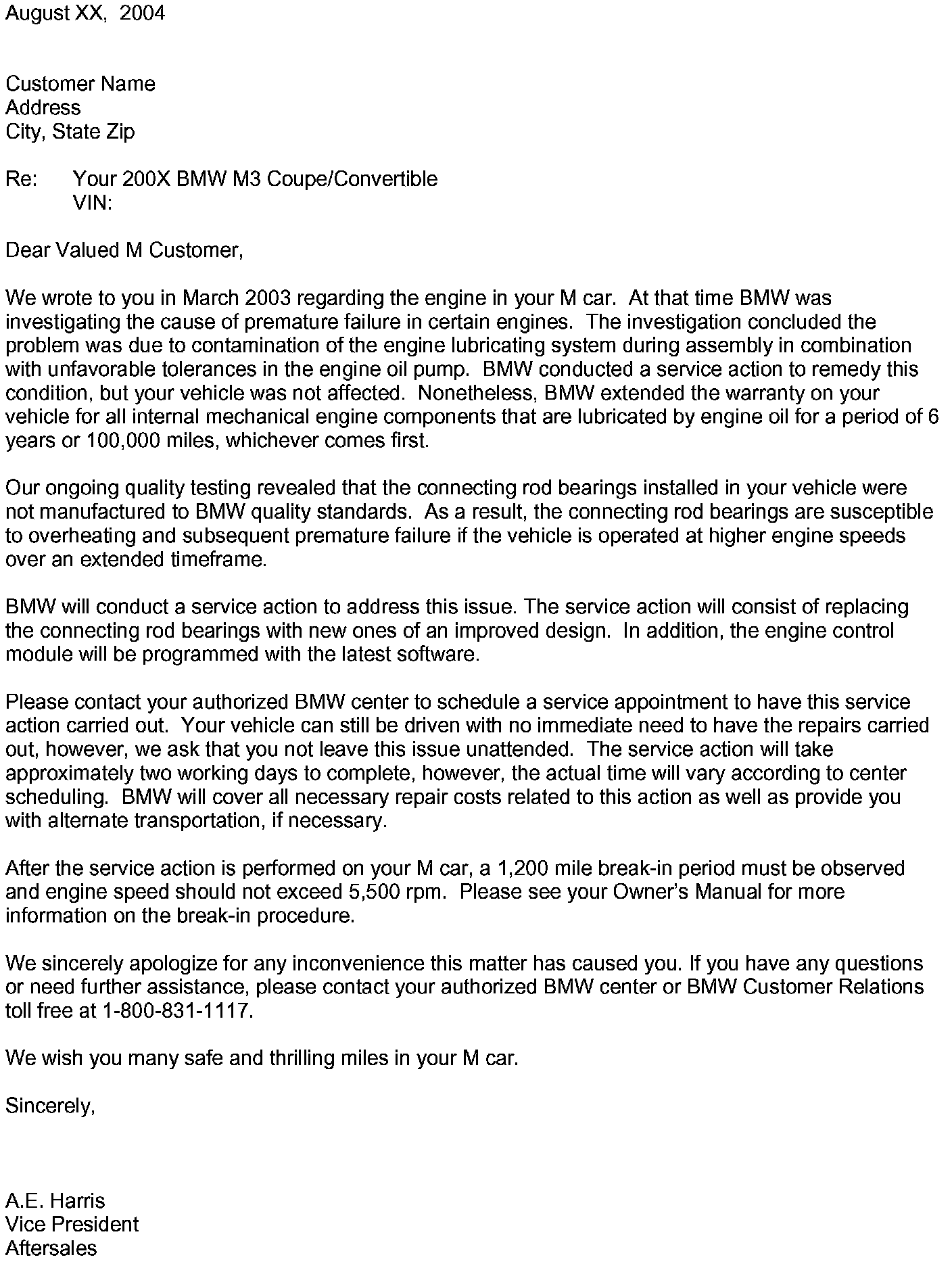 Owner Letter - Vehicles w/first connection rod bearings replac.