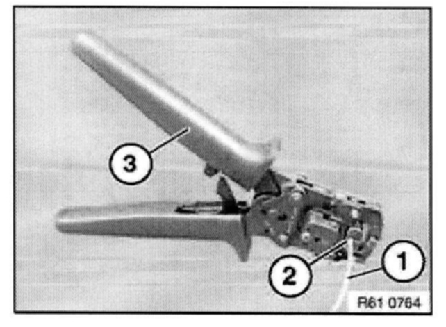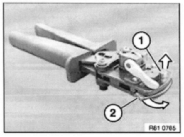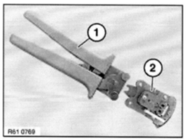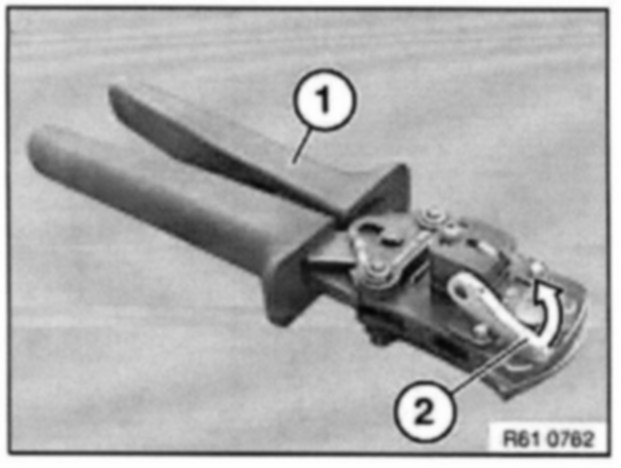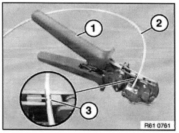 To cut off, strip insulation and cut optical fibers to length, use pliers 61 4 321 (1) in conjunction with crimping head 61 4 322 (2) from crimping set 61 4 320