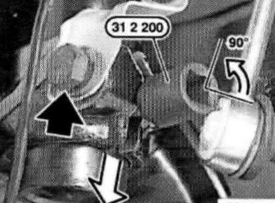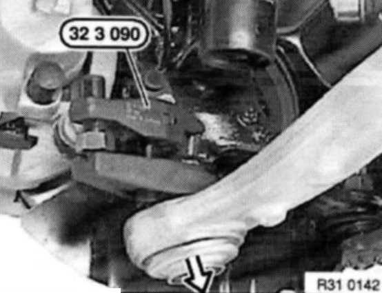 Unfasten nut. Press control arm off steering knuckle with special tool 32 3 090.